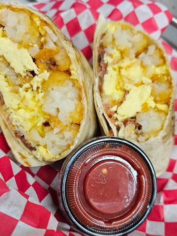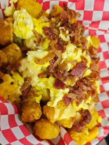 Tots topped with our signature cheese sauce, Bacon, and Scrambled Eggs.