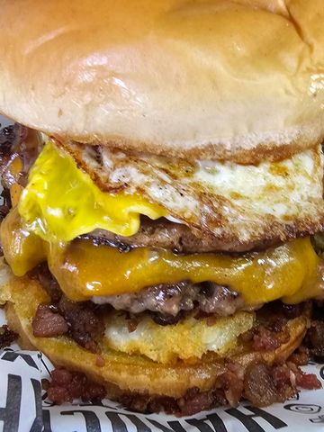 The Hangover cure- Quarter pound Burger patty, Hashbrowns, Ham, Bacon, Sausage patty, topped with a fried egg.
